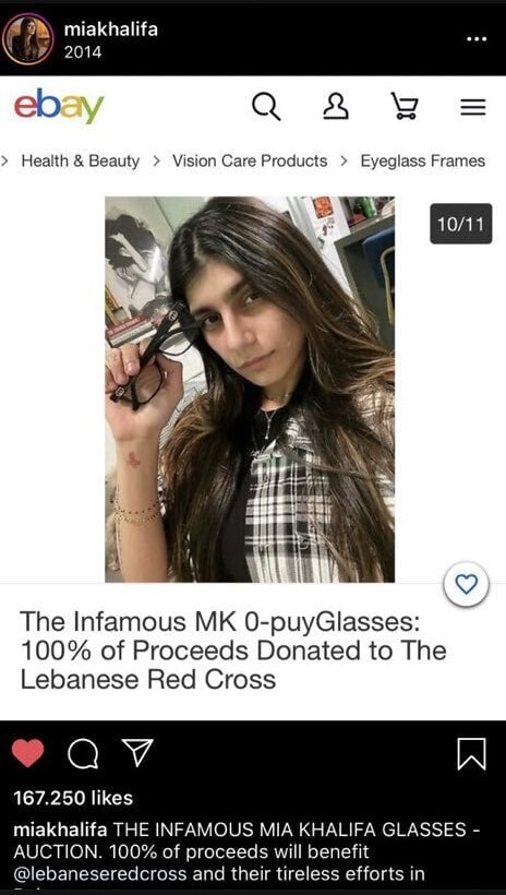 عرضت الممثلة الإباحية السابقة اللبنانية الأصل ميا خليفة نظارتها للبيع على موقع "eBay" من أجل دعم ضحايا تفجير بيروت الكارثي.