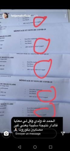نشرت الفنانة المغربية "فاتي جمالي" صورة على حسابها بموقع "إنستغرام" عبر خاصية "ستوري"، تبين نتائج اختبارات الكشف عن فيروس كورونا الخاصة بأسرتها.