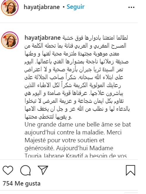 وأضافت حياة جبران في تدوينة بالأنستغرام "اليوم تمر السيدة ثريا جبران بأزمة صحية، ولا اعتراض على ابتلاء الله سبحانه" ، مضيفة "شكراً صاحب الجلالة على رعايتك المولوية الكريمة، شكراً لكل الأطباء الذين يباشرون علاجها".