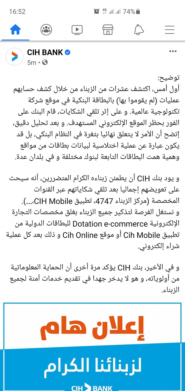 و يود بنك CIH أن يطمئن زبناءه الكرام المتضررين، أنه سيحث على تعويضهم إجماليا بعد تلقي شكاياتهم عبر القنوات المخصصة (مركز الزبناء 4747، تطبيق CIH Mobile،...).