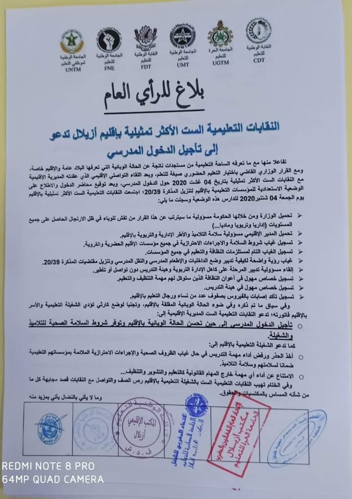 أفاد بيان للنقابات الستة باقليم ازيلال أنه تفاعلا منها مع ما تعرفه الساحة التعليمية من مستجدات ناتجة عن الحالة الوبائية التي تعرفها البلاد عامة واقليم ازيلال خاصة، ومع القرار الوزاري القاضي باختيار التعليم الحضوري صيغة للتعلم، وبعد اللقاء التواصلي الإقليمي الذي عقدته المديرية الإقليمية معها بتاريخ 04 غشت 2020 حول الدخول المدرسي، وبعد توقيع محاضر الدخول والاطلاع على الوضعية الاستعدادية للمؤسسات التعليمية بالإقليم لتنزيل المذكرة 39/20. اجتمعت النقابات التعليمية الستة (Cdt وugtm وumt وfdt وfne و untm) يوم الجمعة 04 شتنبر2020 لتدارس هذه الوضعية وحملت الوزارة ومن خلالها الحكومة مسؤولية ما سيترتب عن هذا القرار من تفش للوباء في ظل الارتجال الحاصل على جميع المستويات (إداريا وتربويا وماديا...)، وحملت المدير الإقليمي مسؤولية سلامة التلاميذ والأطر الإدارية والتربوية بالإقليم.