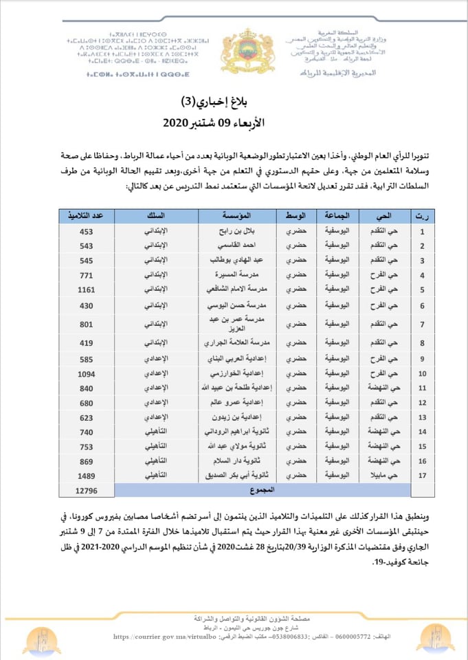 وكانت المديرية الإقليمية أعلنت في بلاغ سابق، الاثنين الماضي، أنه سيتم اعتماد النمط التربوي المبني على التعليم عن بعد في 10 مؤسسات بالرباط إلى حين تحسن الوضعية الوبائية.