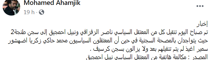 وكتب أحمجيق، بحسابه الشخصي على الفايسبوك "تم صباح اليوم تنقيل كل من المعتقل السياسي ناصر الزفزافي ونبيل أحمجيق إلى سجن طنجة2، حيث يتواجدان بالمصحة السجنية، في حين أن المعتقلين السياسيين محمد حاكي زكريا اضهشور سمير اغيذ لم يتم تنقيلهم بعد ولا يزالون بسجن كرسيف".