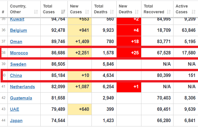 وتخطى المغرب، وفقا لحصيلة آخر 24 ساعة ، حالات الإصابة المسجلة في الصين (85184 حالة) وفي دول أخرى كان الوباء منتشرا فيها بشكل أوسع كهولندا (82099) واليابان (74544)، حيث من المرجح أن يصبح المغرب في حال استمرار الوضع الوبائي بهذه الوتيرة التصاعدية، من الدول التي تجاوز عدد الاصابات بها أزيد من 100 ألف حالة والبالغ عددها حاليا 34 دولة، من بينها 3 دول عربية هي السعودية وقطر ومصر.