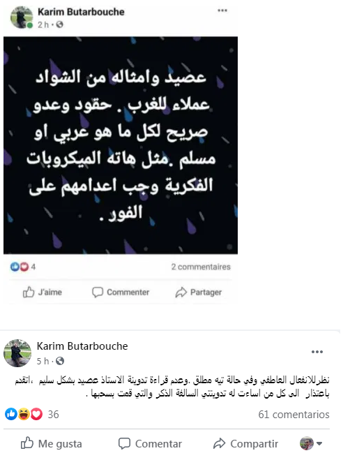 طالب القيادي في حزب التقدم والاشتراكية، كريم بوطربوش، بإعدام الناشط والباحث الأمازيغي أحمد عصيد، من خلال تدوينة مثيرة للجدل، قال فيها “عصيد وأمثاله من الشواذ، عملاء للغرب. حقود وعدو صريح لكل ما هو عربي أو مسلم. مثل هذه الميكروبات الفكرية وجب إعدامهم على الفور”.