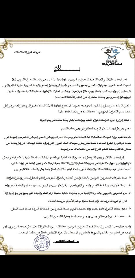 كما يدين المكتب الإقليمي تقديم رؤساء المؤسسات ما اعتبره كأكباش فداء للتغطية على صعوبات تدبير البروتوكول الصحي الموكول لشخص مدير المؤسسة في غياب تام للمواد البشرية المساعدة خاصة على مستوى مؤسسات العالم القروي التي تعرف تشتت الوحدات في ظل غياب من يمكن له القيام بعملية التعقيم التي لا تعد من اختصاصات مدير المؤسسة.