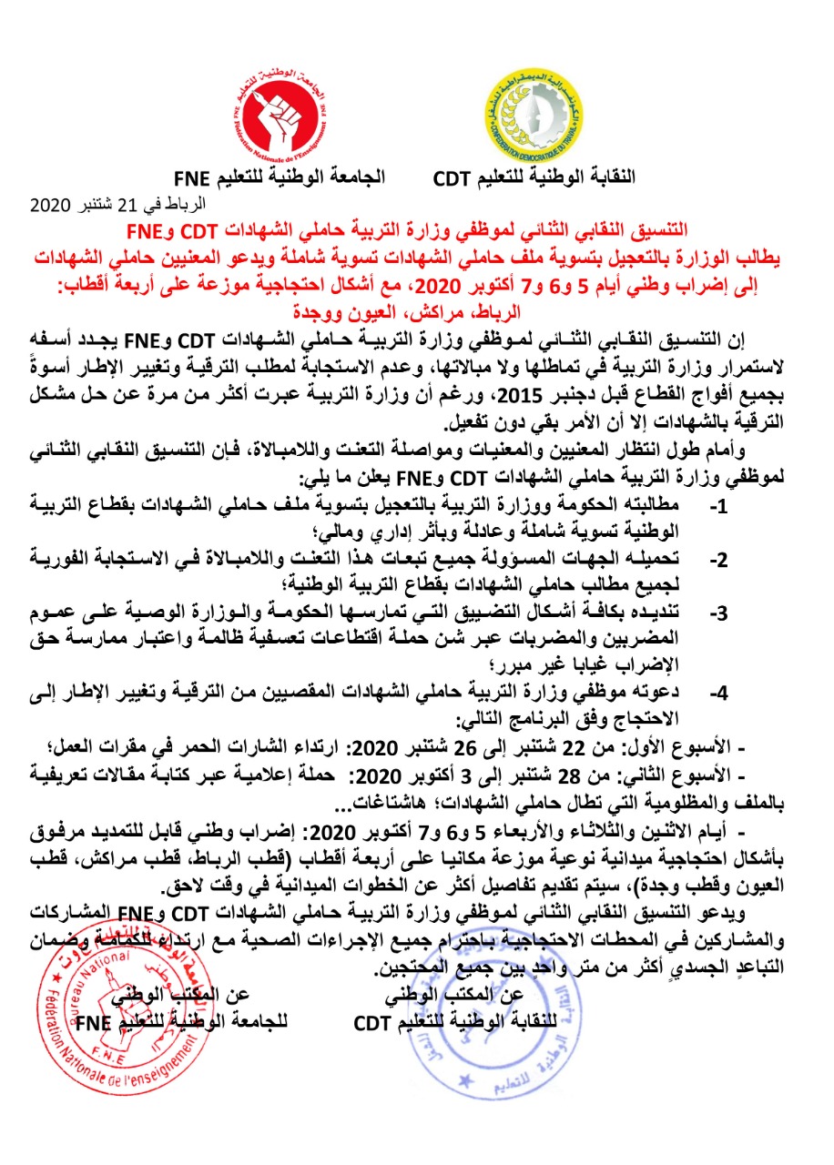 طالب التنسيق النقابي الثنائي لموظفي وزارة التربية حاملي الشهادات CDT وFNE وزارة التربية الوطنية والتكوين المهني والتعليم العالي والبحث العلمي بالتعجيل بتسوية ملف حاملي الشهادات تسوية شاملة، ودعا المتضررين حاملي الشهادات إلى خوض إضراب وطني أيام 5 و6 و7 أكتوبر 2020 قابلا للتمديد، مع أشكال احتجاجية موزعة على أربعة أقطاب: الرباط، مراكش، العيون ووجدة.