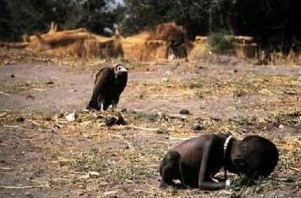 3- حاز المصور كفن كارتر على جائزة ال Pulitzer لهذه الصوره التي تستعرض طفل يعاني من سوء التغذية الواضح وهو يزحف نحو معسكر الامم المتحدة الذي كان ملجأ لضحايا المجاعة ويقدم الغذاء في السودان.يظهر في الصورة نسر يقف على بعد امتار من الطفل منتظرا موته حتى يتغذى على جثته لا احد يعرف بمصير الطفل لكن المصور انتحر بعدها بثلاثة اشهر نتيجة الكآبة التي اصابته بسبب تواجده في السودان لتغطية احداث المجاعة في حينها.