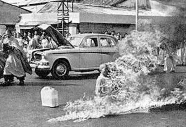 4-التقط هذه الصورة المصور مالكوم براون في 11 يونيو 1963 عندما قام الراهب الفيتنامي ثيك كونق دس باشعال نفسه حتى الموت في احد أشهر واكثر شوارع سايقون ازدحاما .جاء الحادث كاعتراض ومحاولة لفت النظر لمشكلة رهبان البوذية الذين عانوا تحت نظام ديم الكاثوليكي الذي تحكم في جنوب فيتنام حينها.كان الرهبان يطالبون بحقوق تتساوى مع الرهبان المسيحين لكن النظام مارس عليهم القمع ومنعهم و من رفع اعلامهم الخاصة ومن ممارسة طقوسهم ومعتقداتهم. الغريب ان الراهب لم يتحرك من مكانه اثناء احتراقه ولم يصدر عنه اي صوت!