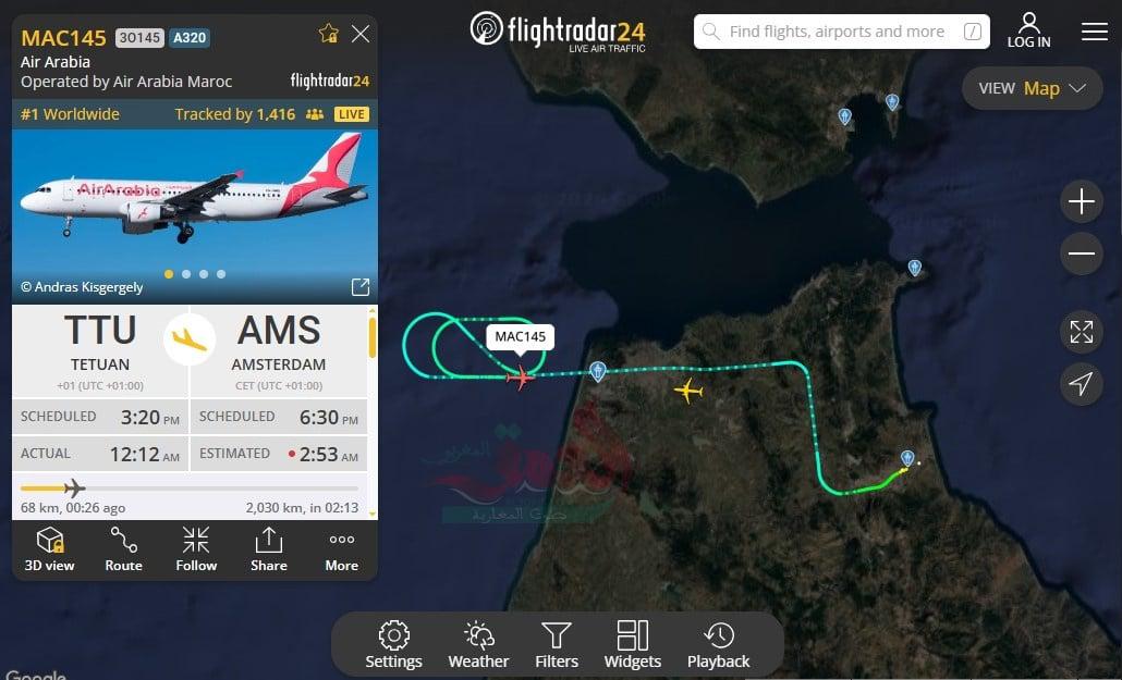 وبحسب معطيات موقع تتبع الرحلات “فلايردار”، فقد تم تحويل الطائرة من طراز Airbus A320-214 بشكل مفاجئ نحو مطار ابن بطوطة طنجة، حيث بقيت تحلق في الأجواء في انتظار ترخيص الهبوط قبل أن تهبط فعلياً الساعة 03:09 صباحاً، لتستكمل رحلتها نحو أمستردام حيث وصلت حوالي الساعة 06:00 صباحاً، في رحلة وصفها ركابها بالمرهقة وغير المفهومة.