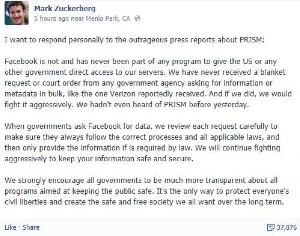و أكد مارك زوكربيرج، مؤسس "فيس بوك" ردًا علي هذه المحاولات - خلال مشاركة له علي حسابه الخاص - قال فيها :"ردًا على التقارير الصحفية حول الفاحشة المنشور - في إشارة إلى محاولة الحكومات مراقبة المحادثات الشخصية للمستخدمين علي "فيس بوك" - أن الموقع لن ولم يسمح أبدا أن يكون جزءا من أي وسيلة لإعطاء الحكومات امكانية الوصول لمعلومات خدمته.وأكد مارك أنه لم يتلق الموقع أي طلب أو أمر من المحكمة أو من أي مؤسسة حكومية بطلب معلومات أو بيانات التعريف عن المستخدمين، وإذا حدث فأنه يتم التعامل معه قضائيًا ومحاربته بقوة.