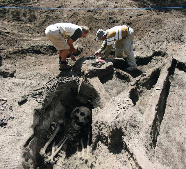 اندهش منقبون من كلية "بلويت" بأميركا من الهياكل العظمية ذات الرؤوس العملاقة والتي يبلغ طولها تسع أقدام، وذلك عندما اكتشفها علماء الآثار في أحد المدافن.