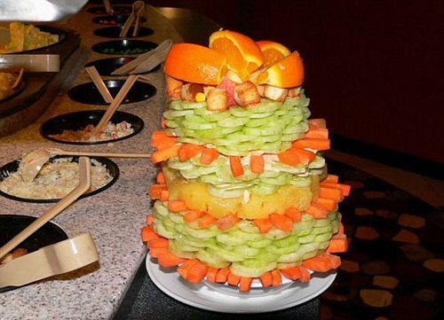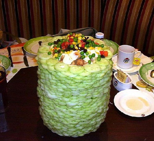وكانوا يتبادلون النصائح حول هذا الأمر بأن يستخدموا في الأساسات خضراوات صلبة، مثل الجزر والخيار، أو الخبز المحمص، وجعل الخضراوات الأكثر مرونة في أعلى البرج.