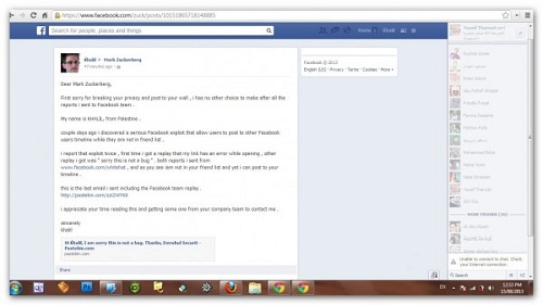 ويتابع خليل شريتح أنه وبعد تجاهل تبليغاته عن الثغرة ما كان منه إلا أن نشر على حائط مارك رسالة شرح فيها الثغرة إضافة إلى نص الرسالة بينه وين موظفي أمان فيسبوك.