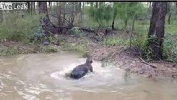 فعند نزول الكلب إلى المياه، أثار ذلك حفيظة الكنغر، فقام بتوجيه عدة لكمات للكلب قبل أن يُحاول إغراقه.