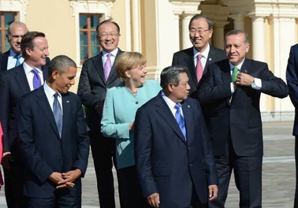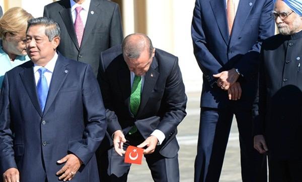الزعيم التركي انحنى ورفع علم بلده وطواه وحفظه في جيبه، جاء ذلك أثناء أخذ الصورة البروتكولية الرسمية على هامش مشاركته بقمة قادة مجموعة العشرين التي اختتمت أعمال قمتها أمس في مدينة سان بطرسبرغ.