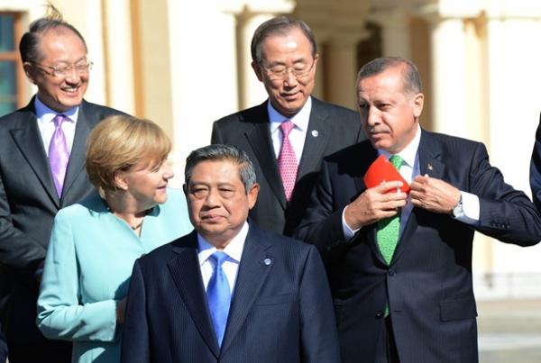 في مشهد اثار إندهاش زعماء العالم، قام رئيس الوزراء التركي رجب طيب أردوغان، برفع علم تركيا من على الأرض والذي يحدد مكان وقوفه.