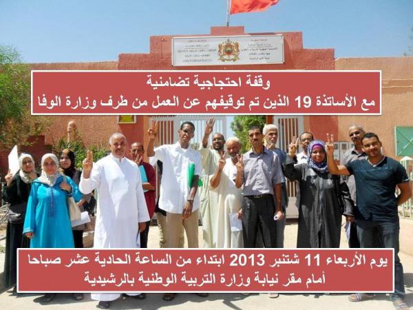 تضامنا مع الأساتذة 19 الذين تم توقيفهم عن العمل مؤقتا من طرف وزارة الوفا منتصف شهر يوليوز الماضي، بسبب رفضهم كأساتذة للسلك الثانوي الإعدادي المشاركة في حراسة امتحانات البكالوريا أحرار الدورة العادية والاستدراكية على اعتبار أنها لا تدخل ضمن اختصاصاتهم . أصدرت النقابات التعليمية الخمس بالرشيدية بيانا مشتركا تدعو فيه الشغيلة التعليمية بالإقليم إلى المشاركة المكثفة في الوقفة الاحتجاجية التضامنية المزمع تنظيمها يوم الأربعاء 11 شتنبر 2013 ابتداء من الساعة الحادية عشر صباحا أمام مقر نيابة وزارة التربية الوطنية بالرشيدية، وذلك احتجاجا على " تشريد 19 أسرة جراء القرار الوزاري التعسفي القاضي بتوقيفهم عن العمل " على حد تعبير البيان والذي يتوفر الموقع على نسخة منه.