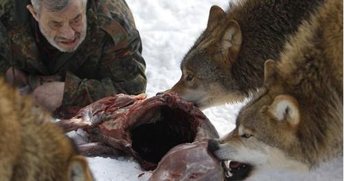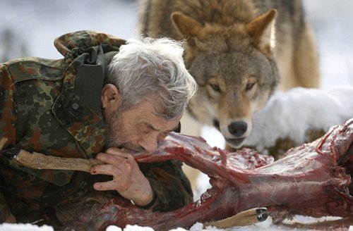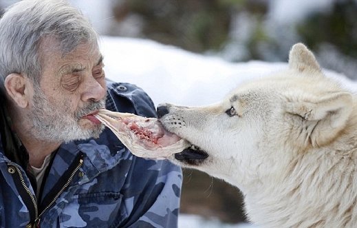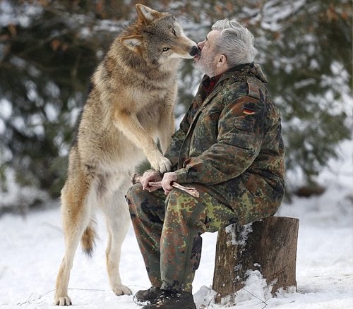 إنه ” لورنير فريند ” الذي يبلغ من العمر 79 عاماً ّ!! الغريب في الأمر والذي تعرضه عليك الصور كما ترى إنه يعيش مع 29 ذئباً يتناولون الطعام من فمه !!  و بالطبع هذا ليس من فراغ لكن ” لورنير ” توصل إلى هذا عن طريق حياته مع تلك الذئاب إلى ما يقرب من 40 عاماً  !! . وهذا كله تم  في محمية Merzig بألمانيا