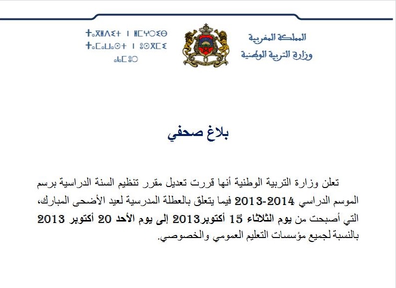 قررت وزارة التربية الوطنية تعديل مقرر تنظيم السنة الدراسية برسم الموسم الدراسي 2014-2013 فيما يتعلق بالعطلة المدرسية لعيد الأضحى المبارك، التي أصبحت من يوم الثلاثاء 15 أكتوبر2013 إلى يوم الأحد 20 أكتوبر 2013 بالنسبة لجميع مؤسسات التعليم العمومي والخصوصي.