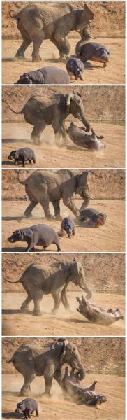 وأظهرت الصور مشاهد أطاح فيها الفيل بأنثى فرسة النهر في الهواء ثم هجم عليها وأخذ يرطمها بضراوة مستخدماً خرطومه، فيما كانت الفرسة تركز أولوياتها في حماية أطفالها من الفيل الغاضب.