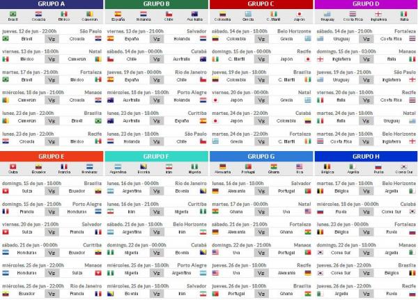 في ما يلي البرنامج حسب المجموعات لنهائيات كأس العالم لكرة القدم، المقررة في البرازيل من 12 يونيو إلى 13 يوليوز القادمين: