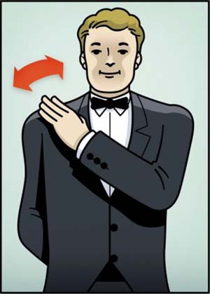 8- تحريك كف اليد على الكتف وكأن النادل يزيل الأوساخ عن كتفه تشير إلى ضرورة تنظيف الطاولة من بقايا الطعام.