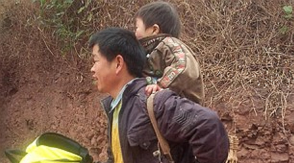 ويحمل يو كسوكانغ (40 عاماً) يومياً طفله البالغ من العمر 12 عاماً على ظهره في سلة صنعها خصيصاً لهذا الغرض، ولم يتوقف عن هذا العمل على الرغم من أنه تسبب بانحناء ظهره والتواء كلتا ذراعيه وساقيه بحسب ما أوردت صحيفة دايلي ميل البريطانية.