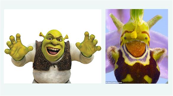 وبمقارنة صور الزهرة مع صورة شريك يتضح مدى التشابه بينهما لدرجة يخال المشاهد أن منتج الفيلم الكرتوني شريك استوحى شخصية الغول من هذه الزهرة النادرة، إذ يتطابقان بنفس الابتسامة والألوان