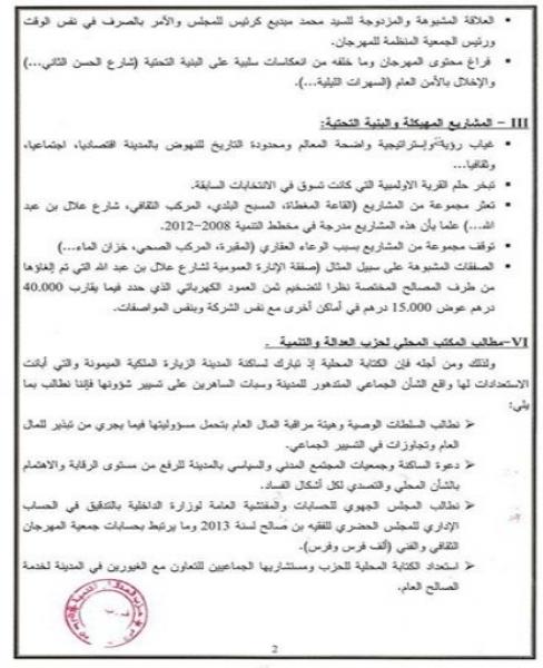 واختتمت العدالة والتنمية بيانها بمطالبة السلطات الوصية وهيأة حماية المال العام بتحمل مسؤولياتها فيما يخص تبذير المال العام وتجاوزات في التسيير الجماعي، وطالب البيان المجلس الجهوي للحسابات والمفتشية العامة لوزارة الداخلية للتدقيق في حسابات المجلس الحضري للفقيه بن صالح لسنة 2013 وفي مالية مهرجان مبديع ألف فرس وفرس حسب نص البيان.