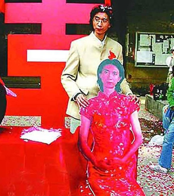 لم يجد رجل صيني شخصاً يحبه أكثر من نفسه، لذلك عمد إلى تصميم نموذج كرتوني مشابه له وقرر الزواج منه، وذلك في ليلة رأس السنة عام 2007، وظهر الرجل البالغ من العمر 44 عاماً والذي يعترف بنرجسيته وهو يرتدي بزة حمراء تعبيراً عن رفضه للواقع بعد أن فشل في العثور على الزوجة المناسبة.