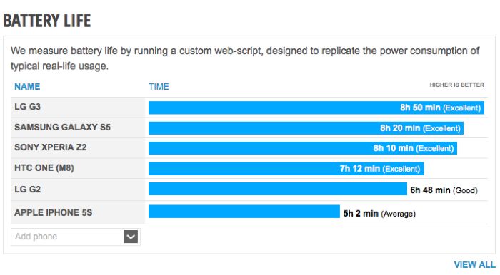 هذه الشاشة وهذا الوضوح العالي كان سبباً في تخوّف الجميع من إستهلاك البطارية ولكن في الواقع اختلفت الامور كثيراً فبحسب مقارنات قام بها الموقع الشهير phonearena كانت الأمور مطمئنه إلى حدٍ كبير حيث تغلب الهاتف على جميع منافسيه مثل جالكسي S5 و اكسبيريا Z2 و M8 وآيفون 5S في الصمود وفي سرعة الشحن ايضاً وهذا أمر مثير للإعجاب وسيمنح الهاتف الذي يعمل على بطارية بسعة 3000 mAh دفعه كبيره للأمام .