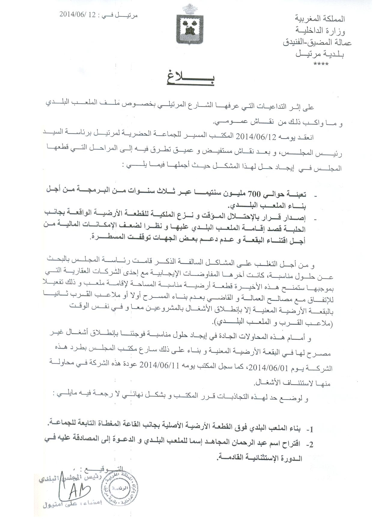 أعلن المجلس البلدي لمدينة مرتيل تشبثه بإقامة الملعب البلدي للمدينة في البقعة الأرضية نفسها التي كانت تحتضن هذا الملعب سابقا. وكشف بيان صادر عن المجلس البلدي، ننشر نصه الكامل، أن "بناء الملعب البلدي لمرتيل سوف يتم فوق القطعة الأرضية الأصلية، بجانب القاعة المغطاة التابعة للجماعة"، مثلما اقترح الملجس البلدي "اقتراح اسم عبد الرحمن المجاهد اسما للملعب البلدي.