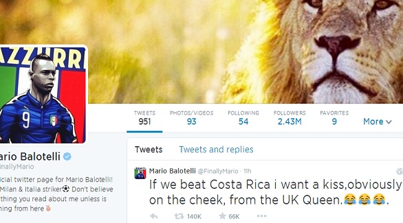 وكتب اللاعب ذو الأصول الغانية في تغريدة على تويتر: "في حال فوزنا على كوستاريكا، أريد قبلة من ملكة بريطانيا إليزابيث، بالتأكيد على الخد"، مشيراً إلى أن المنتخب الإنجليزي بانتظار هدية من نظيره الإيطالي. وحصدت تغريدة بالوتيلي أكثر من 160 ألف "ريتويت" خلال ساعات من تغريده بها.