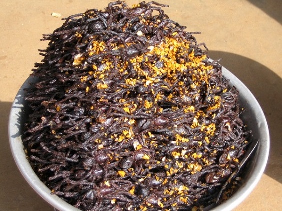من أغرب المأكولات التي يمكن أن تصادفها في كمبوديا طبق العناكب المقلية، وتعود نشأة هذا الطبق إلى ستينيات القرن الماضي، عندما عانى السكان من نقص شديد في المواد الغذائية، فكان لا بد لهم من البحث عن بدائل من الطبيعة لسد جوعهم، فنشأت بعض الأطباق التي تعتمد على الحشرات بالدرجة الأساسية.
