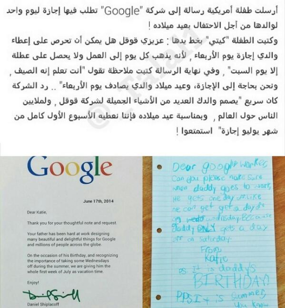والغريب في الموضوع أن جوجل قامت بالرد السريع ، واستجابت لطلب الطفلة ، وأعطت للرجل بدل من يوم واحد ، أسبوع كامل لقضاء أجازة سعيدة .