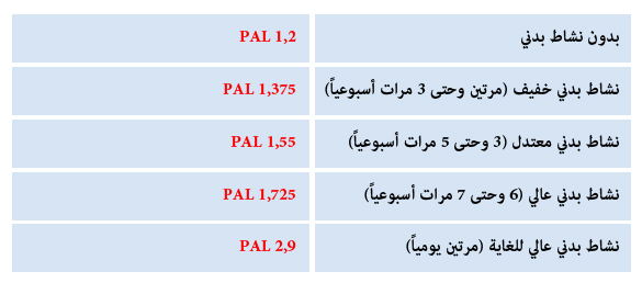للحصول على مجموع الطاقة المستهلكة (TEE) جيب علينا ضربه بمستوى النشاط البدني (PAL).