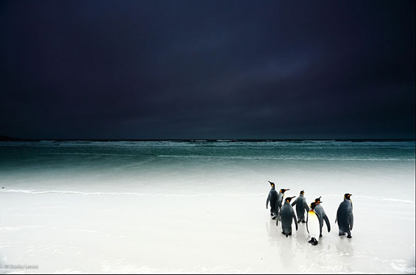 الفراغ في خلفية البطريق يتحدث بصوت أعلى من هدوء المكان، بينما تبدو تلك الكائنات المحببة كملوك في أرضها البيضاء.