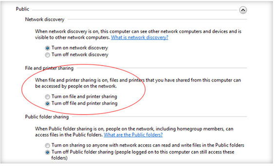 إذا كان الاتصال عبر ويندوز تأكد من إغلاق خاصية "مشاركة أو تبادل الملفات" مع التحقق من أن الشبكة المستخدمة عامة وليست خاصة، ولتحقيق ذلك، عليك الذهاب إلى "لوحة التحكم"، ثم "شبكات ومركز المشاركة، ثم تغيير اعدادات المشاركة المتطور، ثم إغلاق مشاركة الملفات عند أيقونة "عام".
