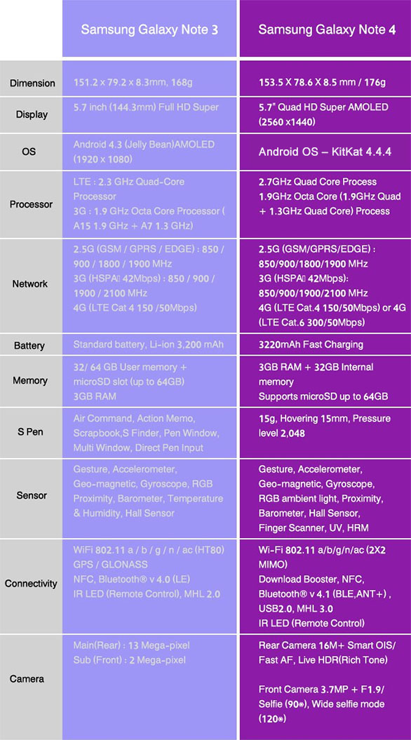 ونقدم لكم في نهاية هذا التقرير جدولاً يوضح الفارق بين جهازي سامسونج جالاكسي نوت 3 وجالاكسي نوت 4.