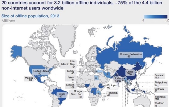 أوضحت الأبحاث أن الغالبية العظمى من سكان العالم المنقطعين عن الإنترنت، أي غير متصلين بها، يتمركزون في 20 دولة، من ضمنها الولايات المتحدة الأمريكية، لكن بالطبع عدد الأشخاص المقيمين في الولايات المتحدة الأمريكية الذين ليسوا على اتصال بالإنترنت أقل بكثير مقارنة بنظرائهم في الدول ذات الكثافة السكانية العالية مثل الهند والصين، أو حتى الدول الأقل كثافة والنامية مثل نيجيريا.