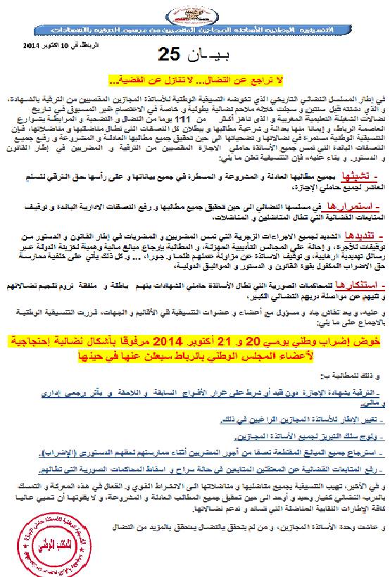 ستخوض التنسيقية الوطنية للأساتذة المجازين المقصيين من الترقية بالشهادة اضرابا وطنيا يومي 20 و 21 أكتوبر الجاري، مرفوقا بأشكال نضالية احتجاجية ممركزة بالرباط سيعلن عنها في حينها.