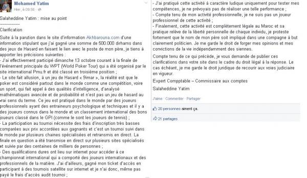 رابعا : اود التاكيد في النهاية ان هذه اللعبة هي لعبة قانونية تماماً في المغرب وممارستها تدخل في نطاق الحرية الشخصية لكل فرد واعبر عن احتجاجي عن إقحام اسم والدي في الموضوع لأهداف سياسوية . وأؤكد انني احتفظ دوما كما تربيت على يديه في تكوين ارائي وقناعاتي الشخصية في استقلال تام عنه وأتحمل لوحدي تبعات اختياراتي الشخصية .