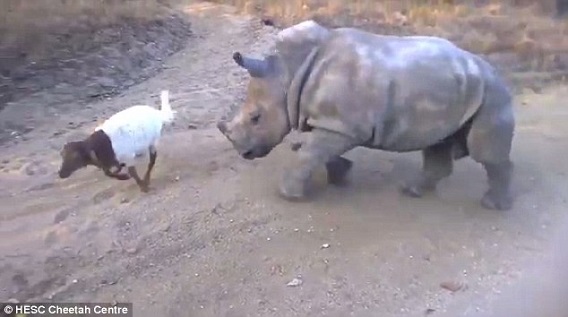 على مدى دقيقة ونصف، تصر الماعز على تعليم وحيد القرن الضخم القفز تماماً مثلها، لكن وزنه الزائد يعيقه عن تقليد حركاتها بخفة ورشاقة على الرغم من محاولاته المتكررة.