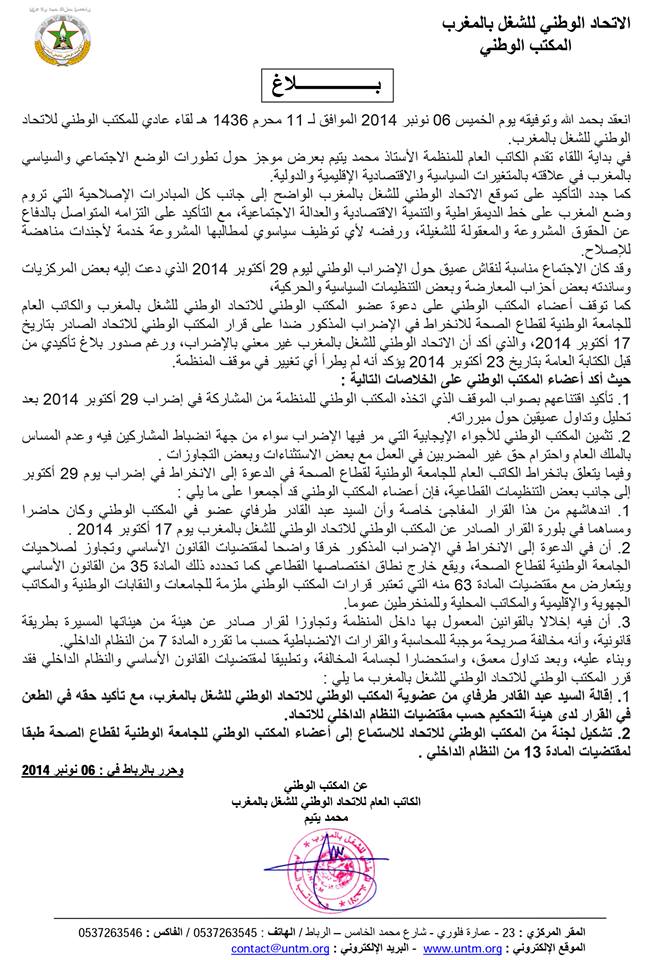 وأوضح البلاغ أن الدعوة إلى الانخراط في الإضراب المذكور يعد خرقا واضحا لمقتضيات القانون الأساسي وتجاوز لصلاحيات الجامعة الوطنية لقطاع الصحة، ويقع خارج نطاق اختصاصها القطاعي، وفق المواد التي تعتبر قرارات المكتب الوطني ملزمة للجامعات والنقابات الوطنية والمكاتب الجهوية والإقليمية والمكاتب المحلية وللمنخرطين عموما.