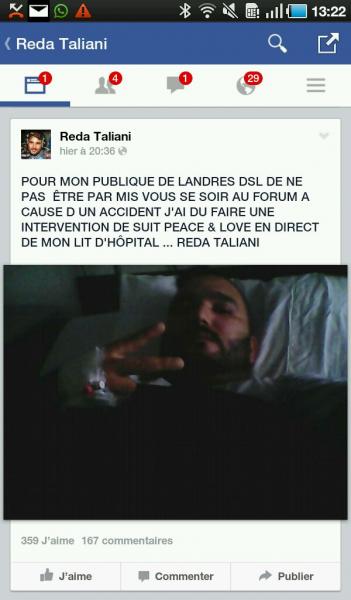 و نشر المغني الجزائري عبر صفحته الخاصة على "فايسبوك" صورة له وهو في المستشفى كما قدم اعتذاره لجمهوره في لندن حيث كان من المفترض أن يحيي حفلًا هناك.