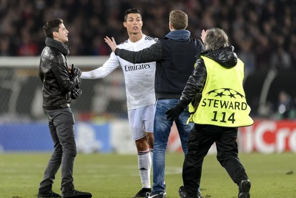 و قبل انطلاق المواجهة اقتحم شابين ارض الملعب ودخلوا في جدال ساخن مع النجم البرتغالي الذي يبدو أنه تساءل عن سبب غضبهم وانزعاجهم رغم أن المباراة لم تبدأ بعد، وخلال ثوان تدخل رجال الأمن وقاموا فورا بطرد الشابين من ارض الملعب.