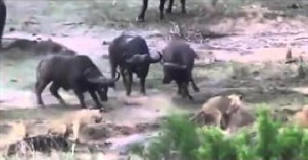 قام بتصوير الفيديو سائح من جنوب أفريقيا ويظهر فيه أربعة أسود قاموا بمهاجمة جاموس ابتعد عن القطيع وعضه لإسقاطه على الأرض، وأثناء استعدادهم لالتهام وجبتهم اللذيذة تفاجئوا بظهور قطيع من الجاموس يقف وراءهم وبدأ واحد منهم بركل وضرب الأسود لإبعادهم عن الضحية وبالفعل نجحوا في إبعادهم وحرروا صديقهم من أيديهم ووقفوا كالحرس حتى يتمكن من الهرب بعيدا عن الأسود.