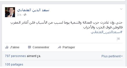 و جاء في تدوينة سعد الدين العثماني، رئيس المجلس الوطني لحزب العدالة والتنمية، في خرجة فيسبوكية قبل قليل: " حتى وإن غادرت حزب العدالة والتنمية، يوما لسبب من الأسباب، فلن أغادر المغرب، فالوطن فوق الحزب والأحزاب".