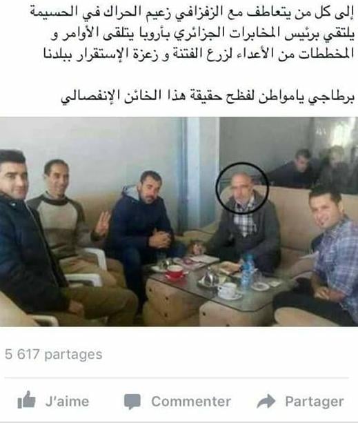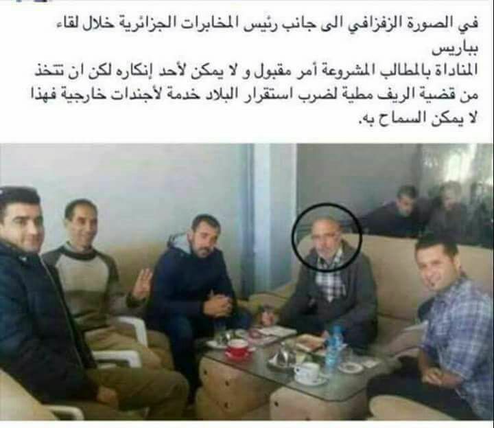تداولت مجموعة من الصفحات الفايسبوكية ، صورة قالت أنها من لقاء جمع ناصر الزفزافي برئيس المخابرات الجزائرية في العاصمة الفرنسية باريس ، متهمة قائد حراك الريف بتلقي الأوامر و المخططات من الجارة الجزائر لزرع الفتنة و زعزعة استقرار المملكة .